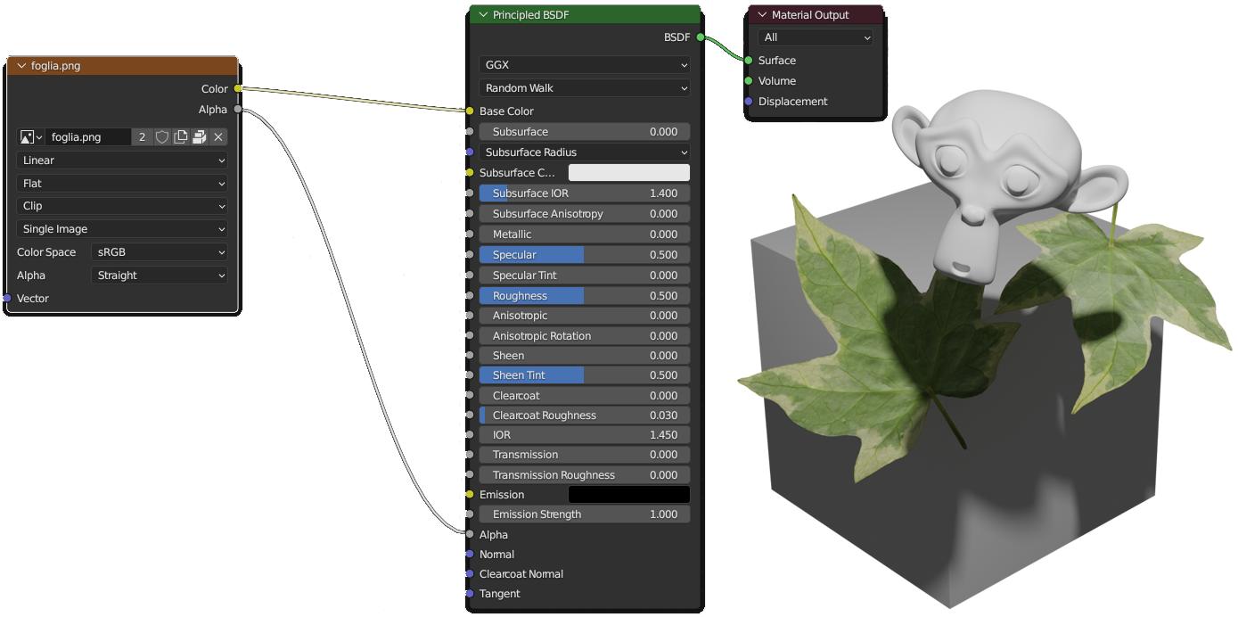 NB: Esiste in Blender un plugin denominato Import-Export: Import Images as Planes che automatizza tutto il processo. Con questo plugin attivo basterà scegliere la voce Images as Planes nella sezione Import del menu File e scegliere un'immagine con alfa per ottenere lo stesso risultato.