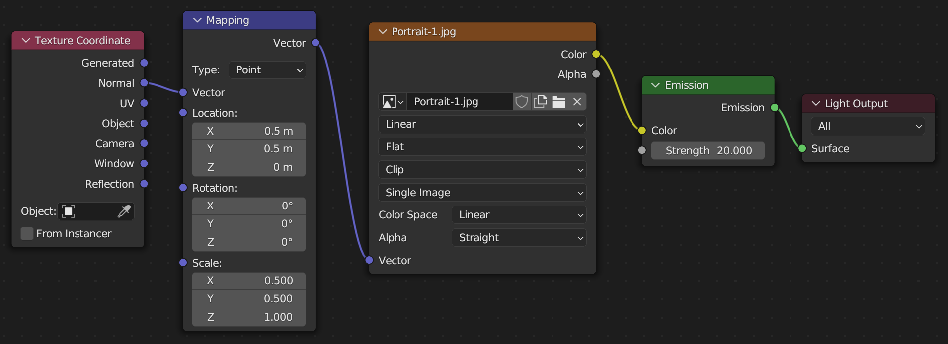 Per ottenere questo effetto seleziona Use Nodes nella sezione Nodes della finestra Object Data Propetries della sorgente luminosa, quindi imposta i nodi come segue: