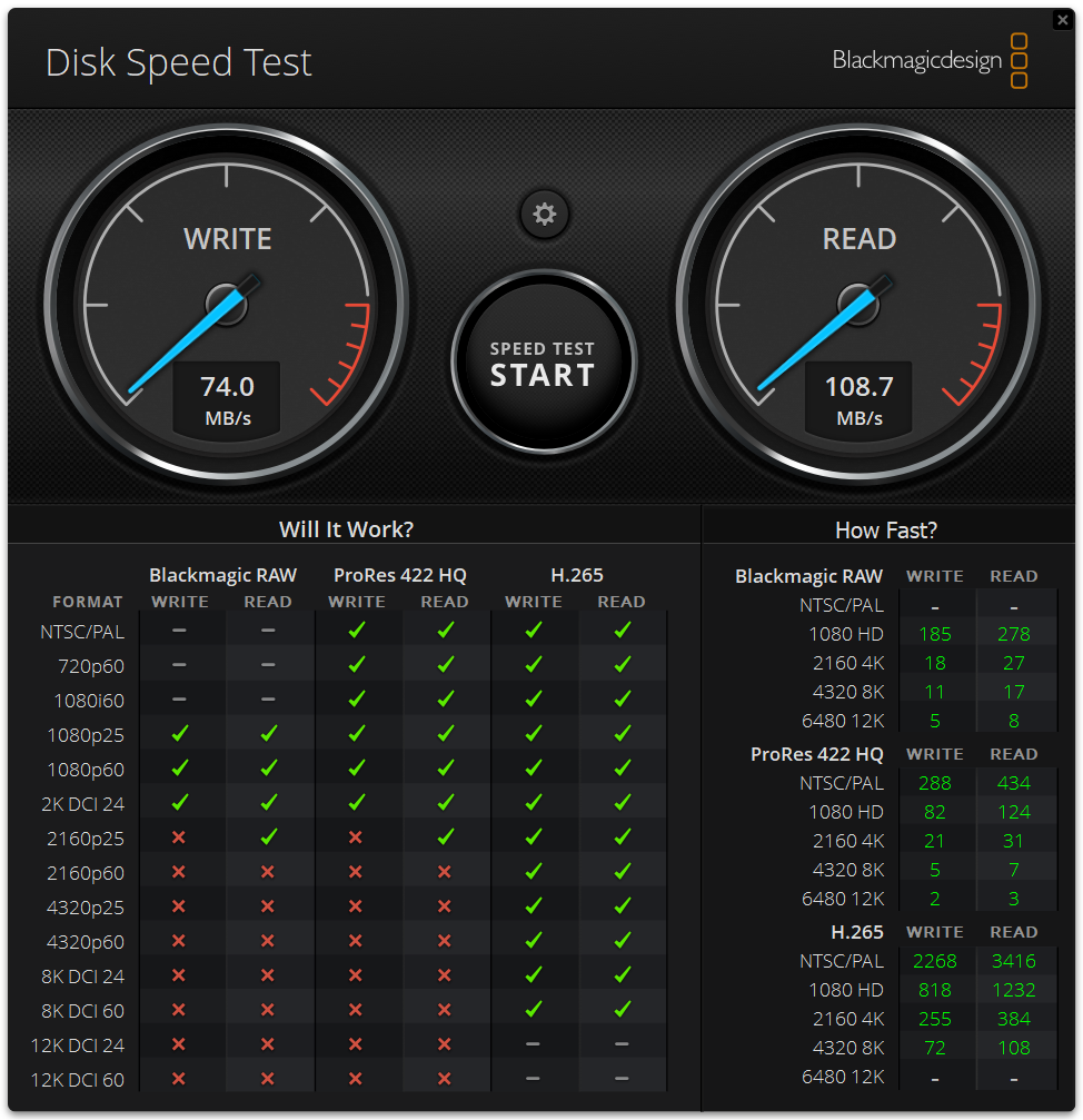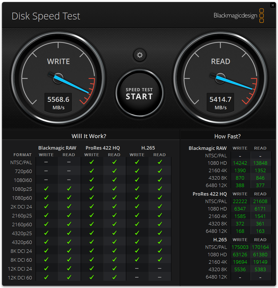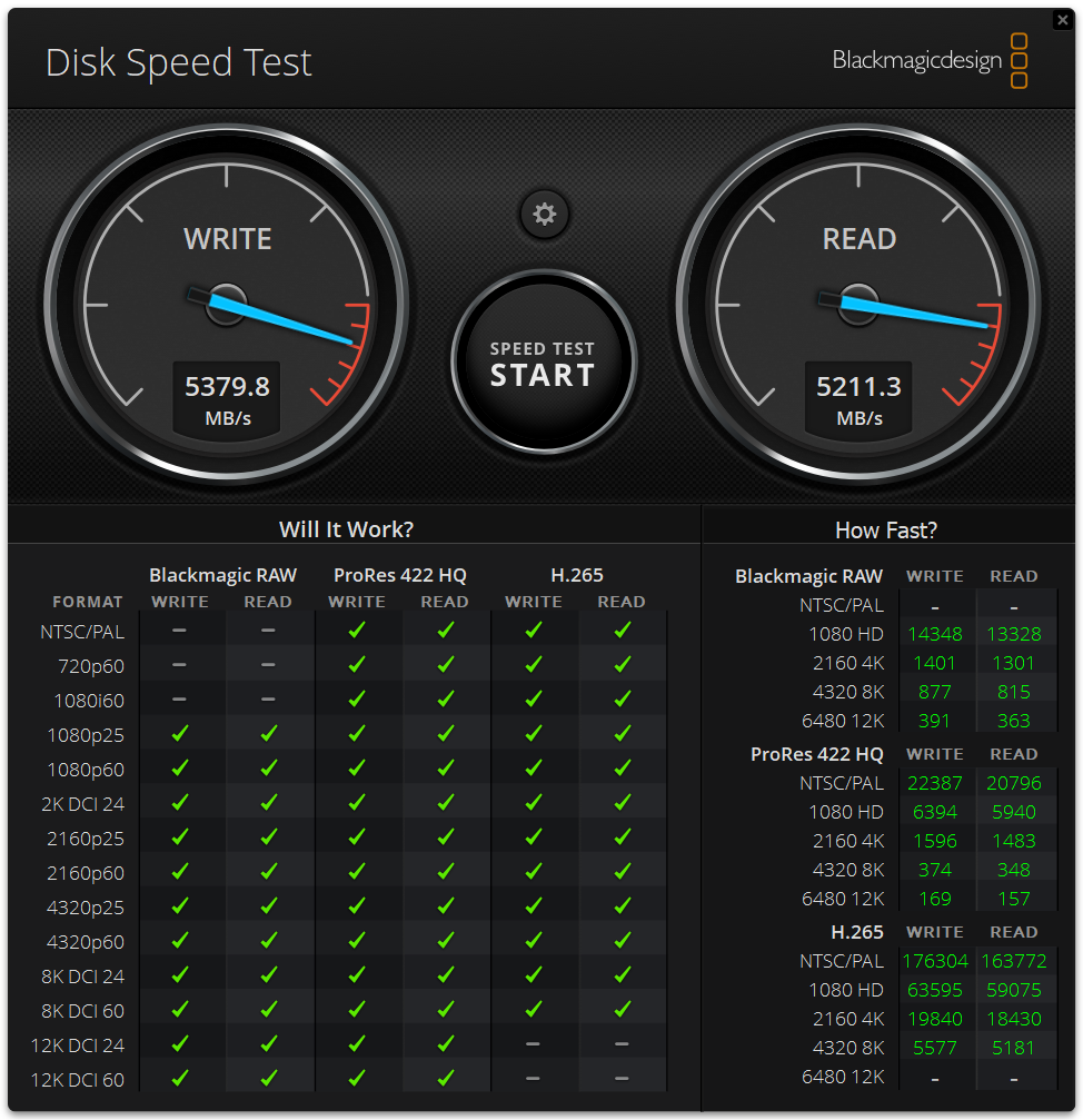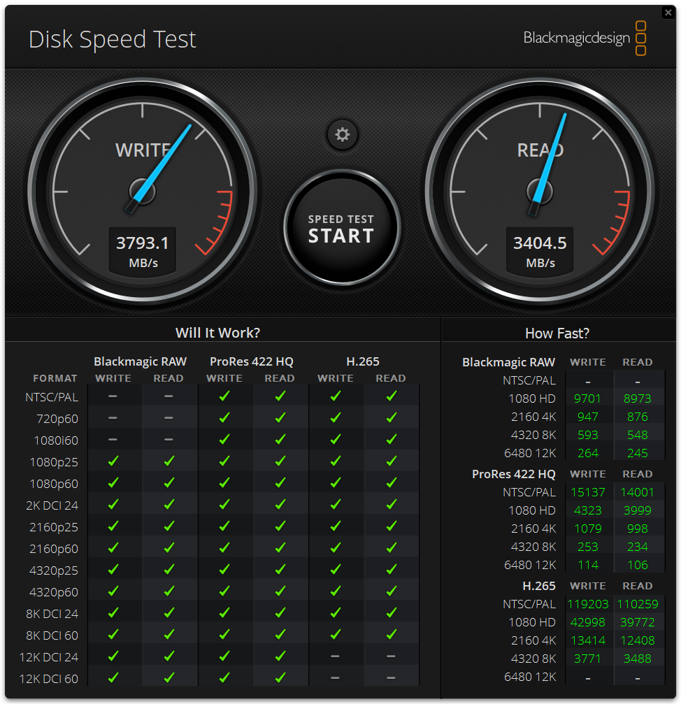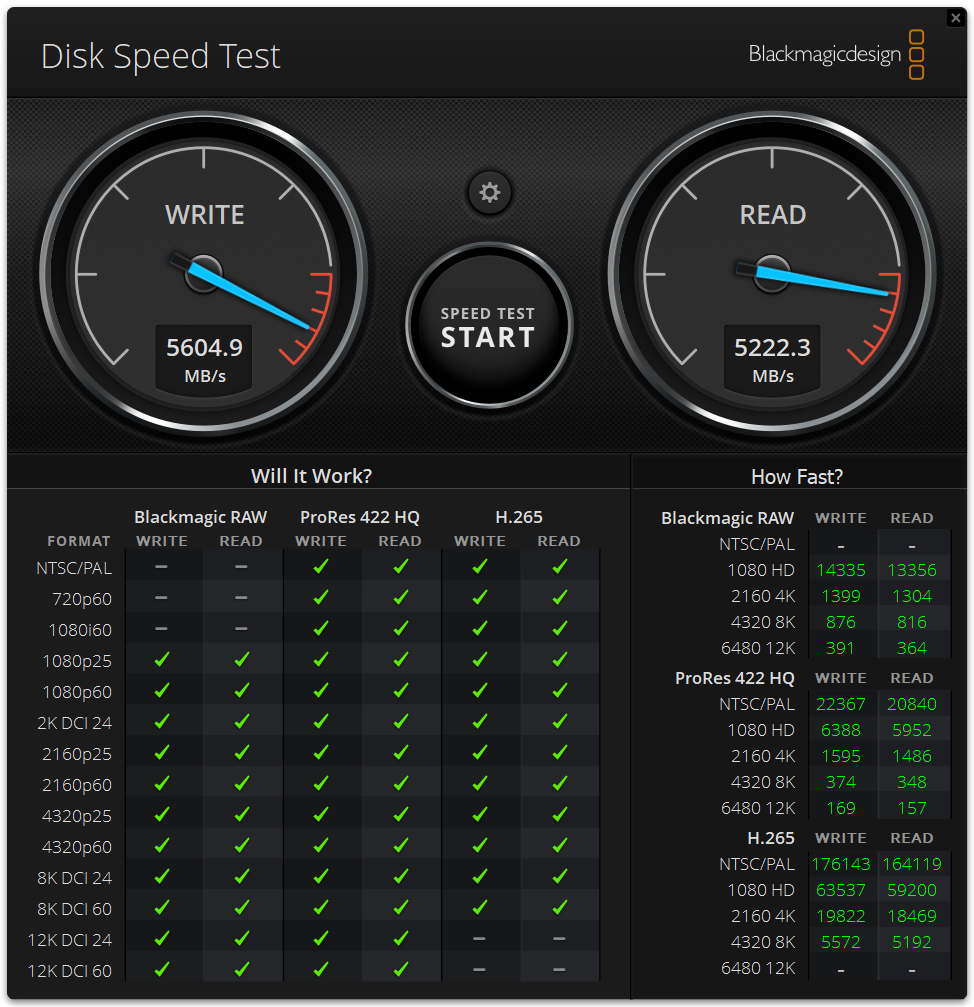 Arrakis dispone di diverse unità disco. Qui di seguito sono riportati i test di velocità eseguiti con l'utility Backmagic Disk Speed Test impostata su 5 GB.