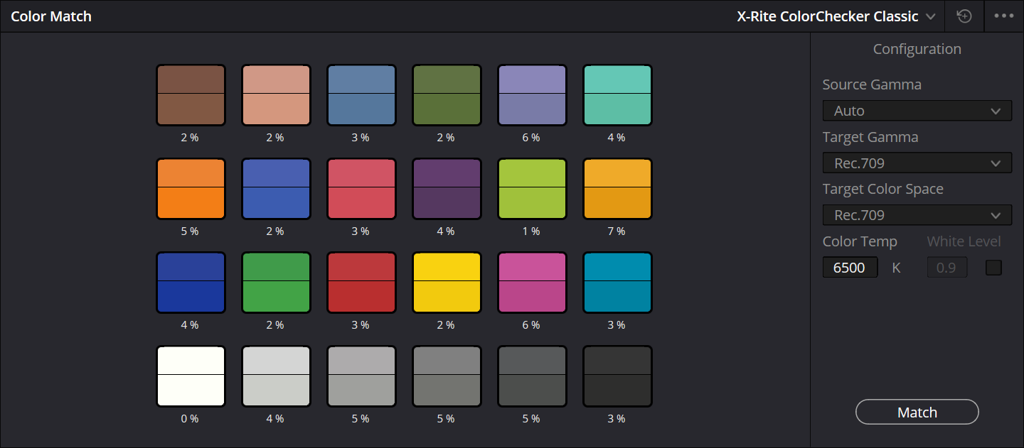 Nella sezione Color di DaVinci Resolve attivare la finestra Color Match e selezionare, nel menu a tendina in alto a destra, il modello di Color Match Card che è stato utilizzato in fase di ripresa. Nel Viewer, in basso a sinistra, scegliere lo strumento Color Match e spostare gli spigoli fino a far sì che i quadratini si trovino tutti all'interno delle relative aree colorate della Color Match Card.