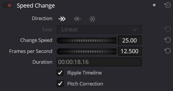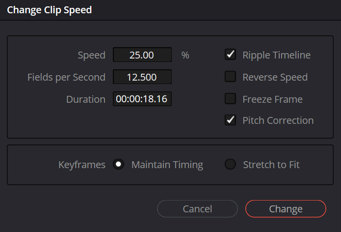 - Duration mostra la durata che avrà la clip applicando la velocità impostata. Se la spunta Ripple Timeline non è attiva, la durata della clip non cambierà.