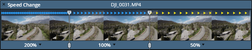 - Change Speed permette di impostare la velocità della clip in percentuale. Ad esempio al 100% la clip verrà riprodotta normalmente, al 50% verrà rallentata alla metà della velocità normale, mentre al 200% verrà accelerata al doppio della velocità normale.