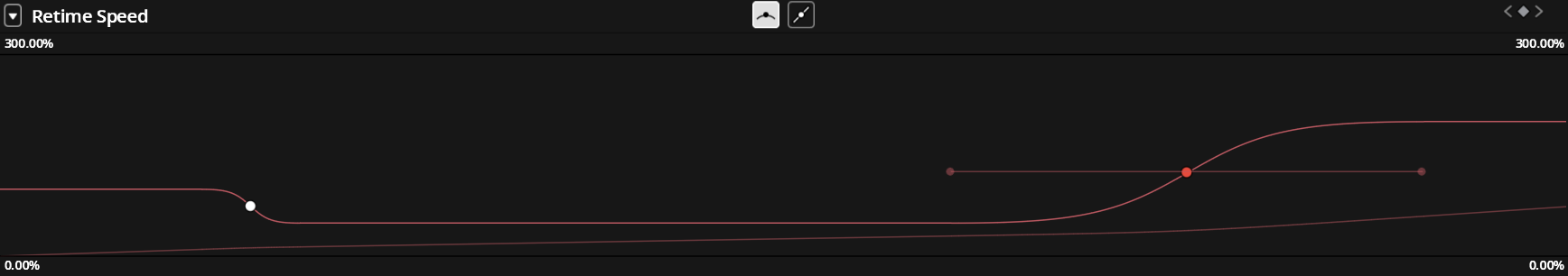- Quando in una clip sono visibili i controlli di Retime, se questa viene estesa o ridotta cliccando sui bordi laterali nella parte più in alto e trascinando, la modifica della durata non ne influenza l'inizio o la fine, ma ne adatta la velocità.